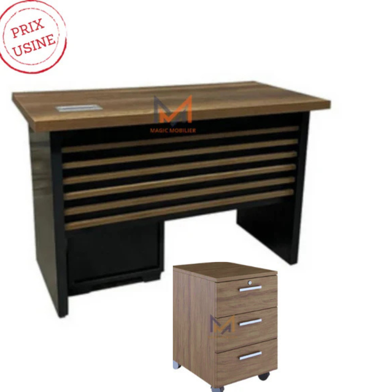 Bureau en bois composé de : 1 plan principal constitué d’un plateau et deux pieds d’épaisseur 19 mm. Profondeur 800 mm hauteur 740 mm 1 voile d’épaisseur 19 mm avec bandes