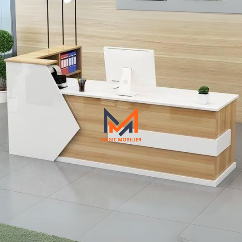 Comptoir d'accueil en bois , un élément fonctionnel et esthétique, moderne et élégant, idéal pour les espaces professionnels et commerciaux.