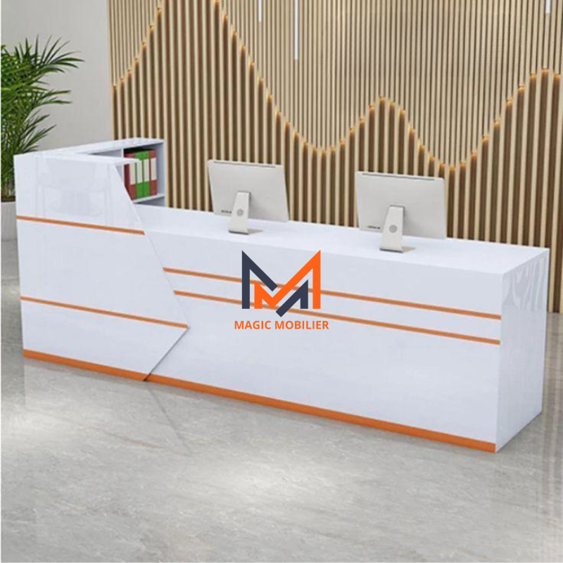 Comptoir d'accueil en bois avec un retour contenant un rangement.