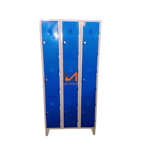 Casier en métal de 3 modules avec 9 portes, fabriqué en acier plaqué avec une finition époxy. Les portes sont lisses, avec fermeture indépendante et équipées de 2 clés. Il comprend également 2 étagères et une ventilation en haut et en bas.