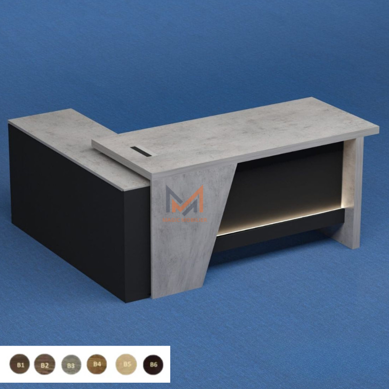 Bureau de direction en bois mélaminé avec retour fixe composé d'une porte battante , étagère et caisson a 3 tiroirs.